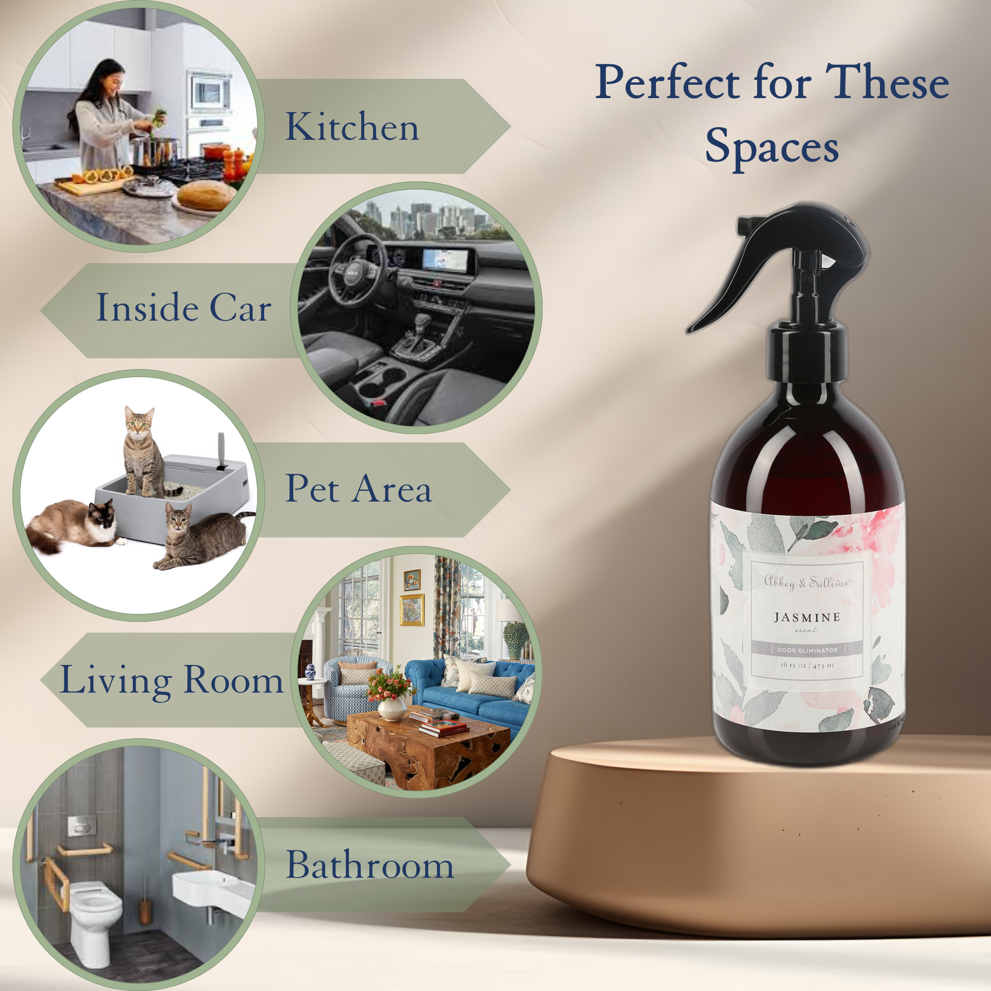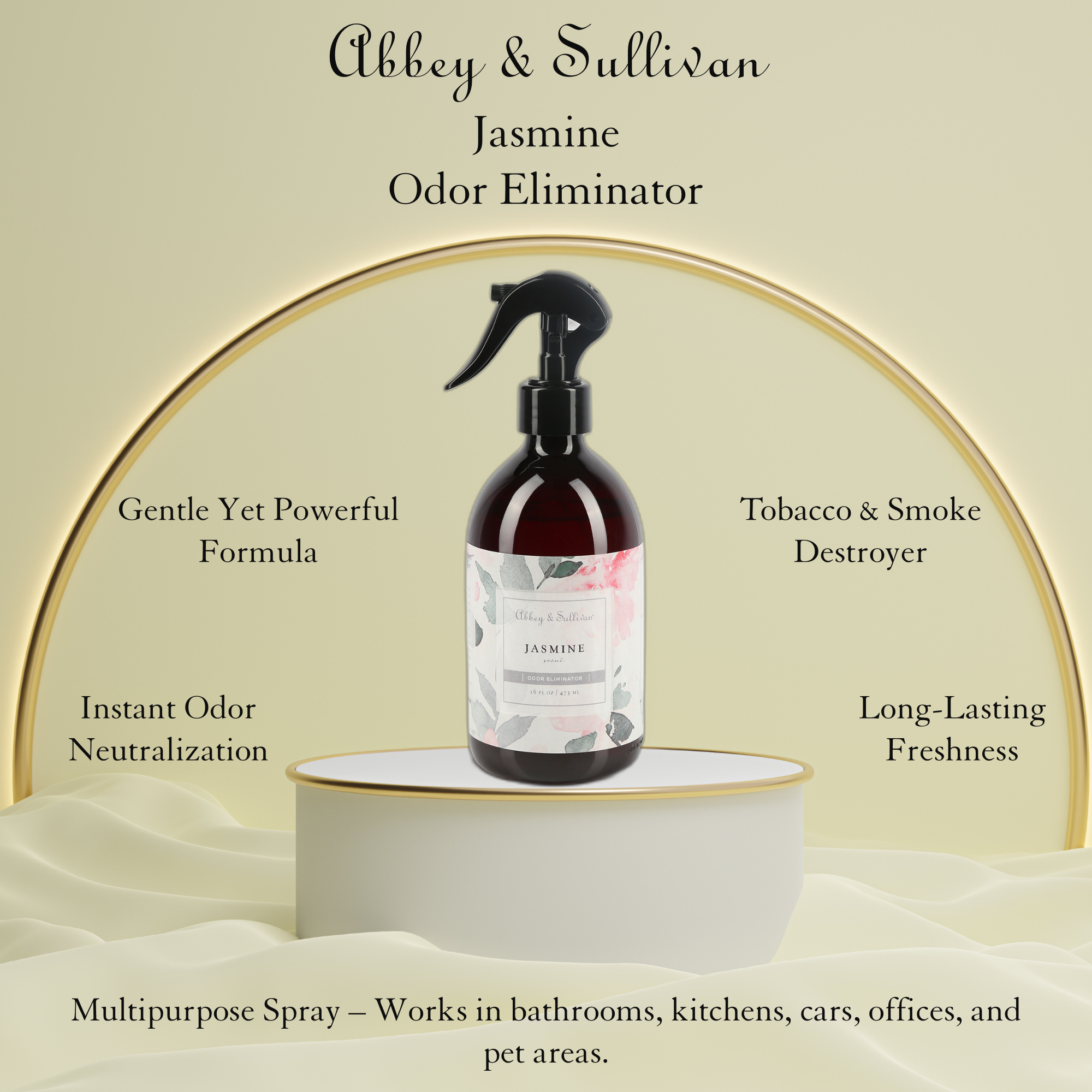 Abbey & Sullivan’s Jasmine Odor Eliminator adds a feminine touch to any environment with its softly seductive floral aroma. Remove smells with an alluring, creamy scent that transforms your home into the setting of a romantic novel. This seductively tempting and pleasantly delicious spray eliminates pet odors in the litter box or dog kennel. To eradicate the everyday smells of the previous users, spray this smooth odor eliminator as the final touch after a musty spring clean or a fresh start at your new home or apartment. This lovely jasmine aroma with a faint woody undertone will eradicate toilet odors and other nasty room scents such as seafood, garlic, or onions. By eliminating residual smells from smoke, cigars, or the previous inhabitant, the tobacco odor destroyer will improve everyone's mood in the boardroom, bathroom, or den. Spritz your new car with this sensual-scent spray to give your personal touch.